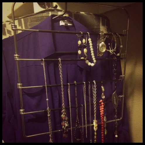Here is a picture of a trick I just figured out trying to organize some new necklaces. I took a pants hanger that was sitting empty and realized it was perfect for all my long jewelry. The bars open so it is great for those necklaces that don’t have clasps.